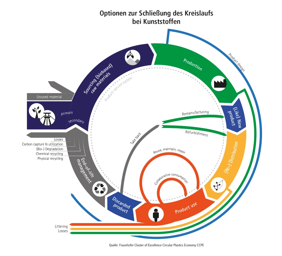 Im Fraunhofer Cluster of Excellence Circular Plastics Economy CCPE bündeln sechs Fraunhofer-Institute unter Leitung des Fraunhofer Umsicht Kompetenzen und Infrastrukturen, um Grundlagen für die Transformation zu einer zirkulären Kunststoffwirtschaft zu erforschen, passgenaue Handlungsoptionen für Wirtschaft und Gesellschaft zu eröffnen und Systemleistungen anzubieten. Systemleistung bedeutet, dass Wirkungen von Innovationen auf vor- und nachgelagerte Stufen im Lebenszyklus berücksichtigt und bewertet werden. So eignen sich zum Beispiel Produkte aus Monomaterial besser für ein werkstoffliches Recycling als solche, die aus vielen unterschiedlichen Kunststoffmaterialien aufgebaut sind. Diese Information ist wichtig für das Produktdesign, um zu einem frühen Zeitpunkt zirkuläre Prinzipien umzusetzen. Im Fraunhofer CCPE wird erstmals am Beispiel Kunststoff erforscht, wie eine gesamte Wertschöpfungskette unter Prinzipien der Circular Economy gestaltet werden muss – und wie dabei die Bedürfnisse von Kunststoffwirtschaft und Gesellschaft integriert werden können. Im Fokus der Forschung steht die Entwicklung von neuen zirkulären Kunststoffen, von Additiven und Compounds mit optimaler Rezyklierbarkeit sowie der Möglichkeit, sich kontrolliert abzubauen, von neuen Recyclingsystemen für das werk- und rohstoffliche Recycling mit dem Ziel, hochwertige Rezyklate sowie Chemikalien zu erhalten, aber auch die Entwicklung von zwei zirkulären Prototypen: eine flexible und digitalisierte Mehrwegtransportbox und ein völlig neu designter Kindersitz. Sustainability-Assessment-Methoden und digitale Technologien vervollständigen den Werkzeugkasten für zirkuläre Geschäftsmodelle.